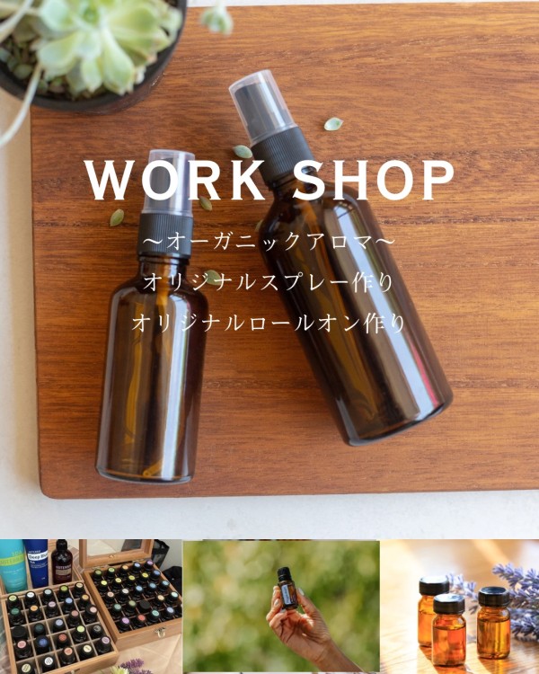 オーガニックアロマオイルを使った、アロマスプレーやロールオン作りのワークショップです。